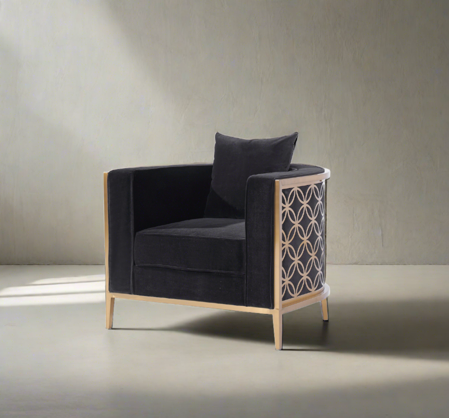Designed for both commercial and personal use, the Veera Accent Chair is ideal for homeowners shopping online for affordable luxury. It appeals to those with a penchant for gold accent chairs, velvet furniture, and the timeless elegance of black and gold decor.